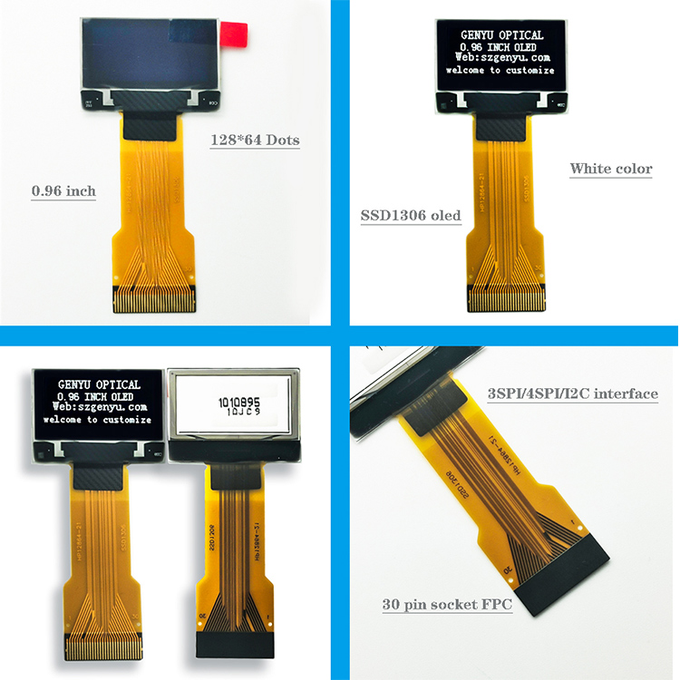 0.96 Inch OLED Display Panel White 128*64 Pixels 30pin FPC Long Socket Type